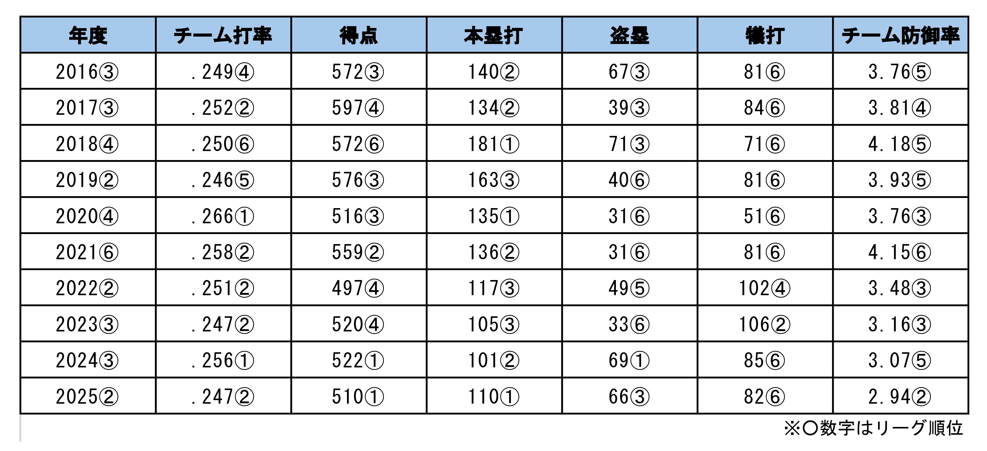 一方で、投手出身の監督として期待された投手陣の強化については、厳しい評価にならざるを得ない。2024年はリーグ1位のチーム打率、得点数を記録しながら、3位に終わった。リーグ5位のチーム防御率3.07が表すように、課題が投手にあるのは明らかだった。