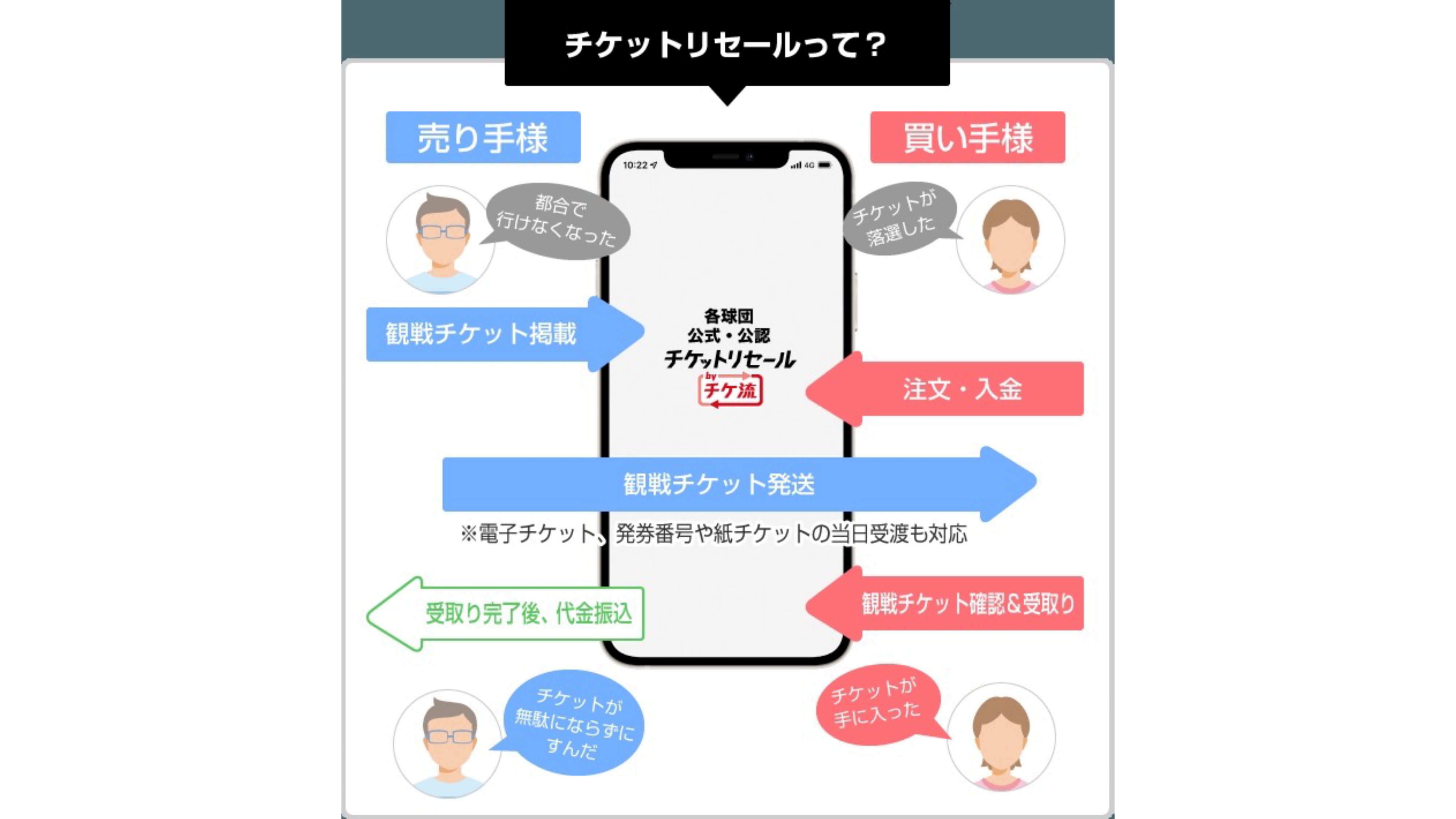 このサービスは、個人間のチケット取次ぎサービス「チケット流通センター(チケ流)」において、行けなくなった観戦チケットを球団ごとのルールに基づきファン同士が自由に売買できるチケットリセールサービスで、電子チケット・発券番号・紙チケット等での取引が試合当日まで利用可能。個人間売買でもファンが安心して利用できるよう、すべての売り手に本人確認を実施し、チケットが届き入場できるまではチケ流が代金を預かる仕組みだ。
