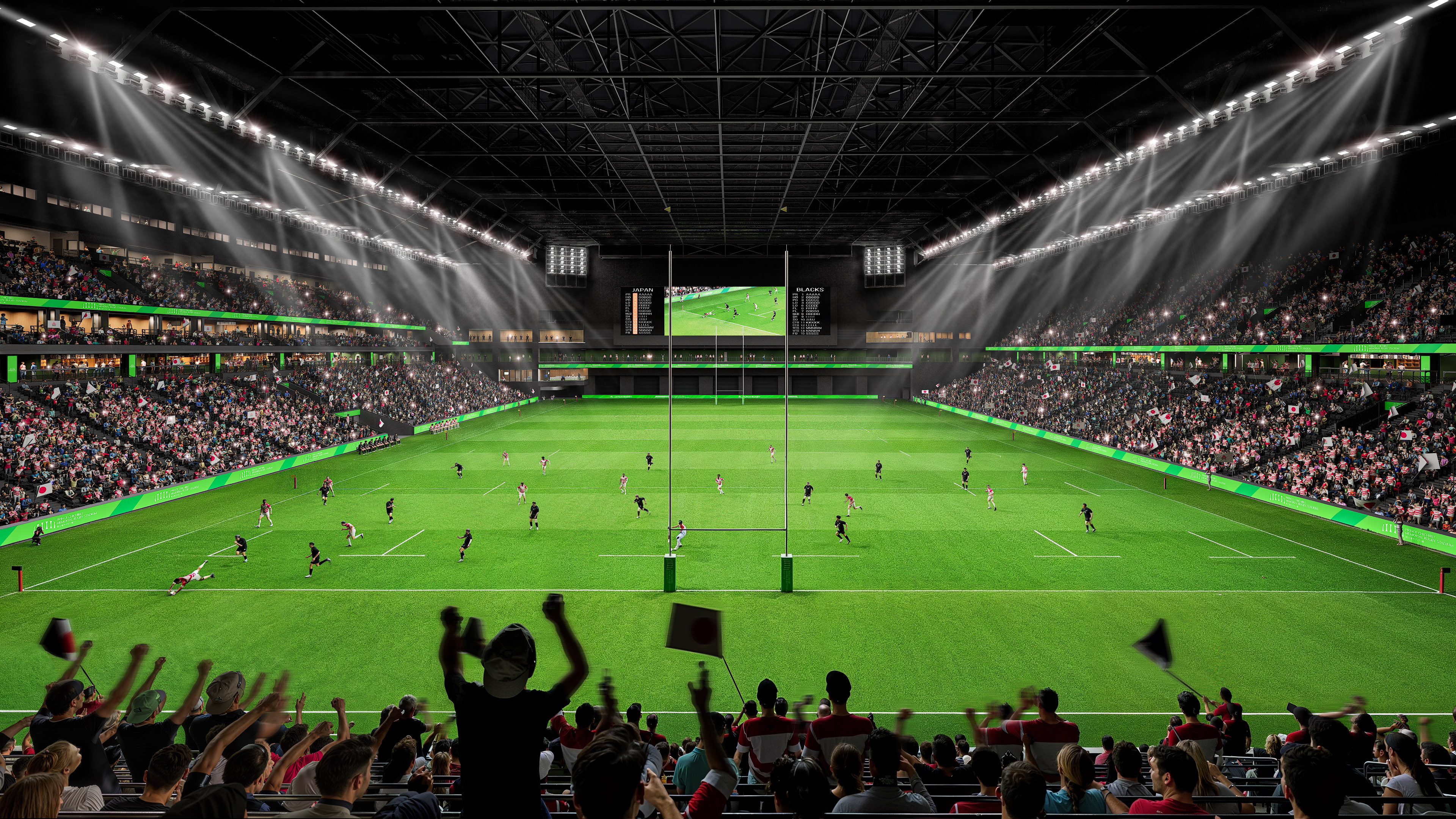 国内初の屋内全天候型ラグビー場として、東西スタンドを均等にした「ダブルメインスタンド」、フィールドコーナー部から試合を体感できる「ラグビータワー」、フィールドと同レベルの観客席「フィールドバー」など、多彩な観戦体験を提供する環境を整備する。さらに環境面では、『LEED GOLD®』や『ZEB Ready』取得を予定しており、ユニバーサルデザインの導入やICT技術の活用など、人にやさしい最高のラグビー環境を実現する。
