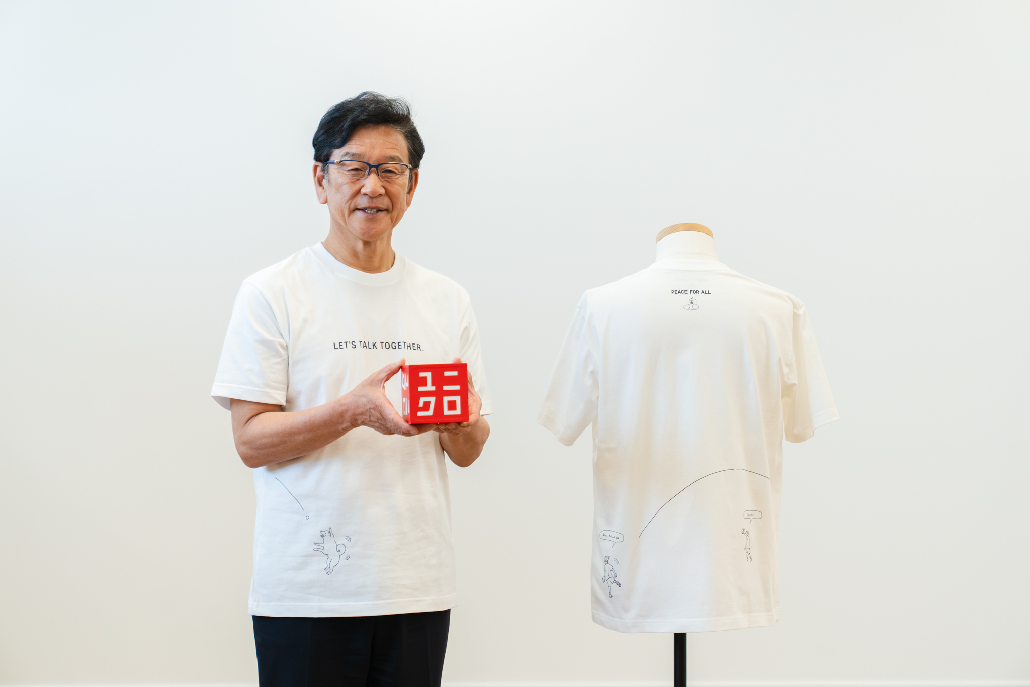 これまで野球界のレジェンド・イチロー氏、元車いすテニス選手の国枝慎吾氏、作家の村上春樹氏、俳優の綾瀬はるかさんら、48組のそうそうたる面々が参加してきた「PEACE FOR ALL」からのオファーに、「世界的なすごい人ばっかりなので、僕で大丈夫ですか?とは思いました」と謙遜しながら、「やらせていただけるなら、お願いします」と快諾。「LET’S TALK TOGETHER.」の文字と、キャッチボールをする人や犬のイラストが描かれた、温かな空気に包まれたチャリティTシャツを完成させた。
