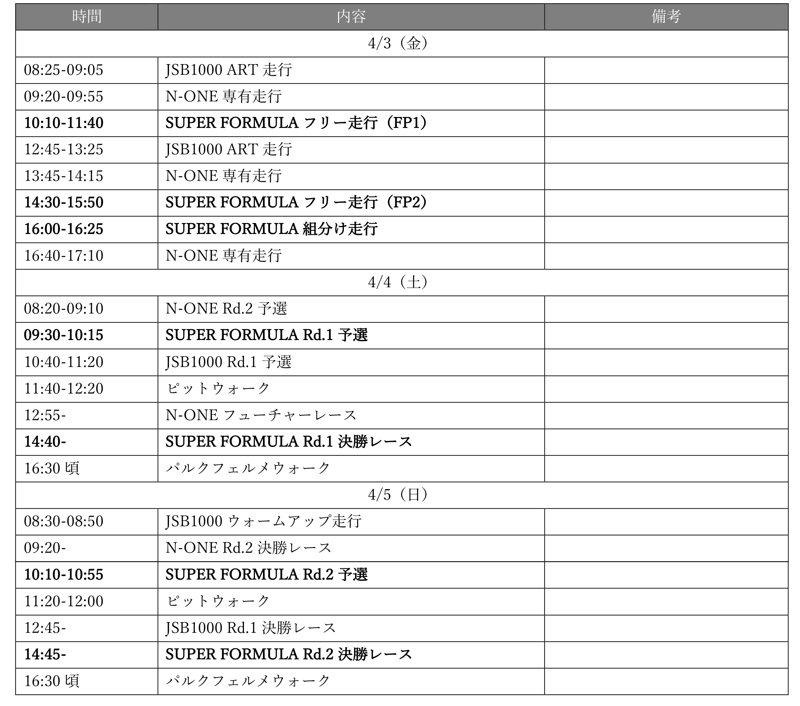 大会は、4月3日(金)にフリー走行、4日(土)に第1戦の予選・決勝レース、5日(日)に第2戦の予選・決勝レースが行われる。また併催で、国内最高峰の二輪レースであるMFJ全⽇本ロードレース選⼿権シリーズの第1戦、N-ONE OWNER's CUP第2戦も同時開催されることが発表された。